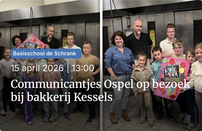 Maandag 13 april was een dag waar de communicantjes 2026 van basisschool De Schrank al een tijdje naar hebben uitgekeken. Samen met hun klasgenoten van beide groepen 4 gingen ze op excursie naar bakkerij Kessels in Ospeldijk, waar ze bij binnenkomst al verwelkomd werden door de heerlijke geur van versgebakken brood.